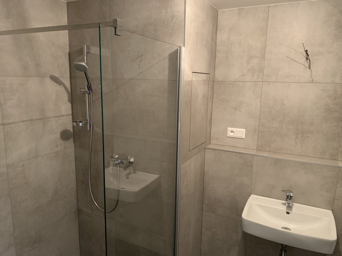 Koupelna s WC je řešena v moderním nadčasovém stylu a nabízí sprchový