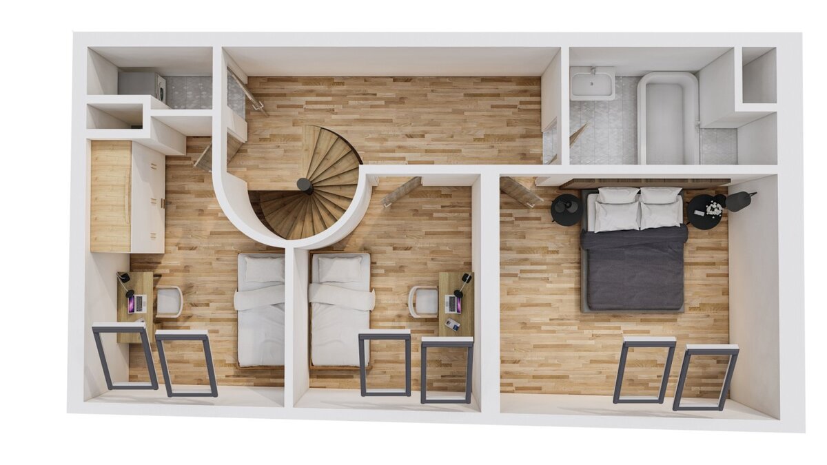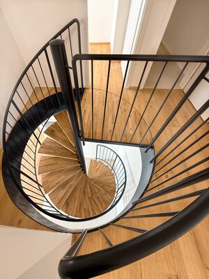 Designové točité schodiště vede do klidové zóny v podkroví, kde se