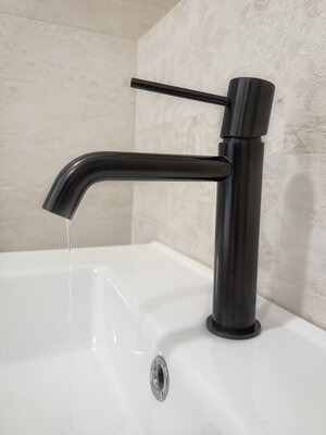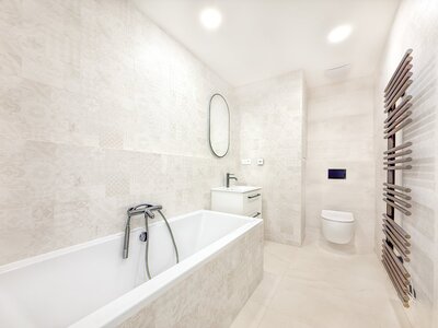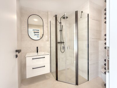 velkoformátová dlažba, kvalitní sanita i dveře vytvářejí elegantní a